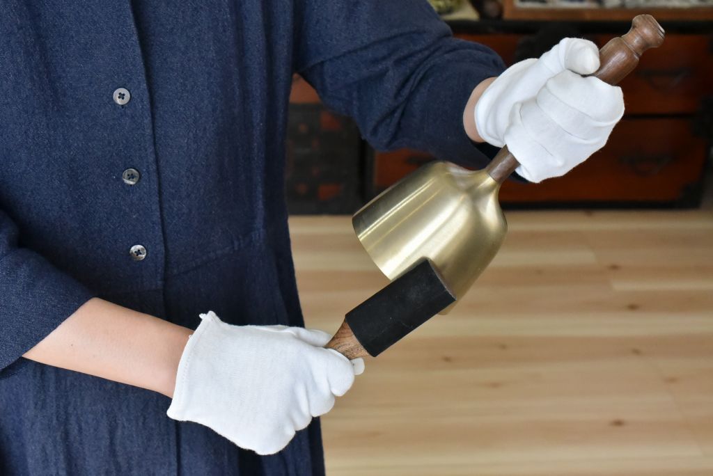 鐘の形をした縁の箇所を、木製のスティックで叩いたり、回したりして鳴らします。