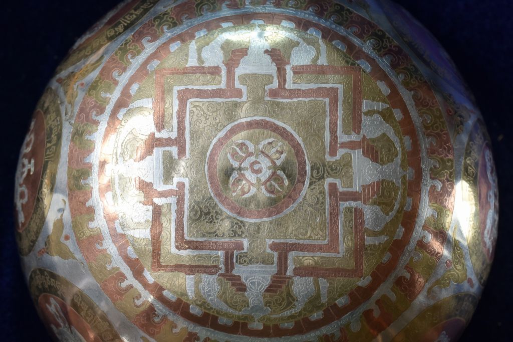 内部中央に観音菩薩、周りにはマントラ、外部周囲には吉祥八紋様、裏側には羯磨を中心に添えた曼荼羅が描かれています。