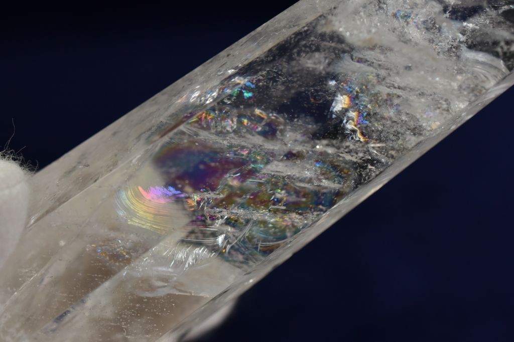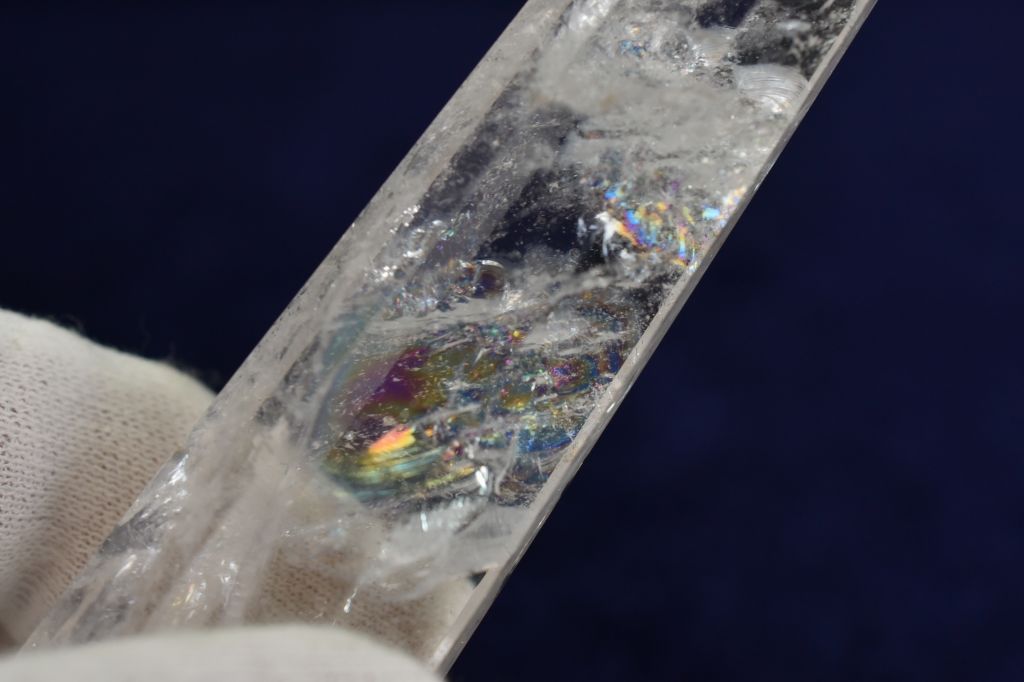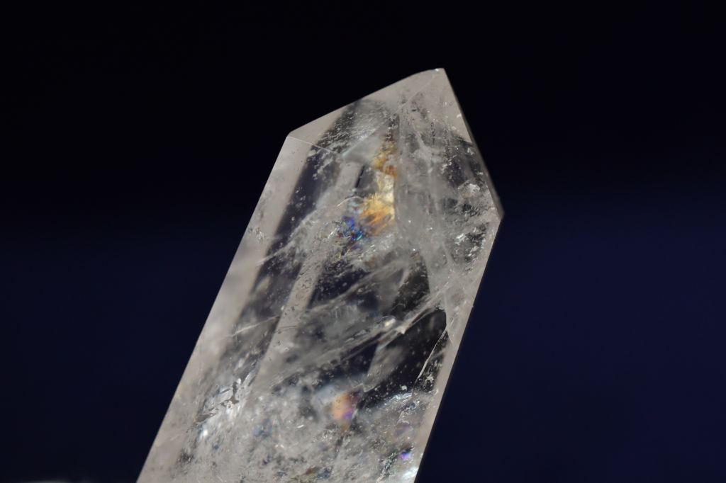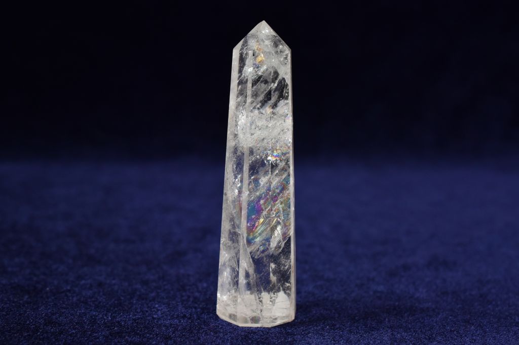 クリアな水晶の中に、レインボーのインクルージョンが光ります。