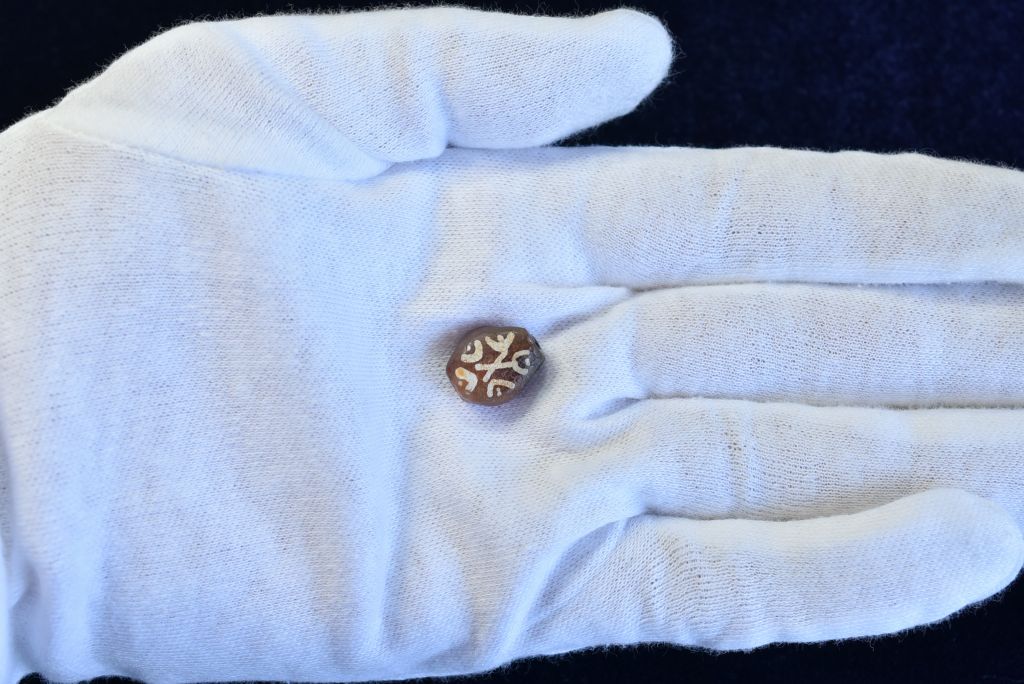 カットしたカーネリアンに、炭酸ナトリウムとケルダ(インドで香辛料として使われる植物)の樹液を混ぜた液体で模様を描き、焼き付けて製作しています。