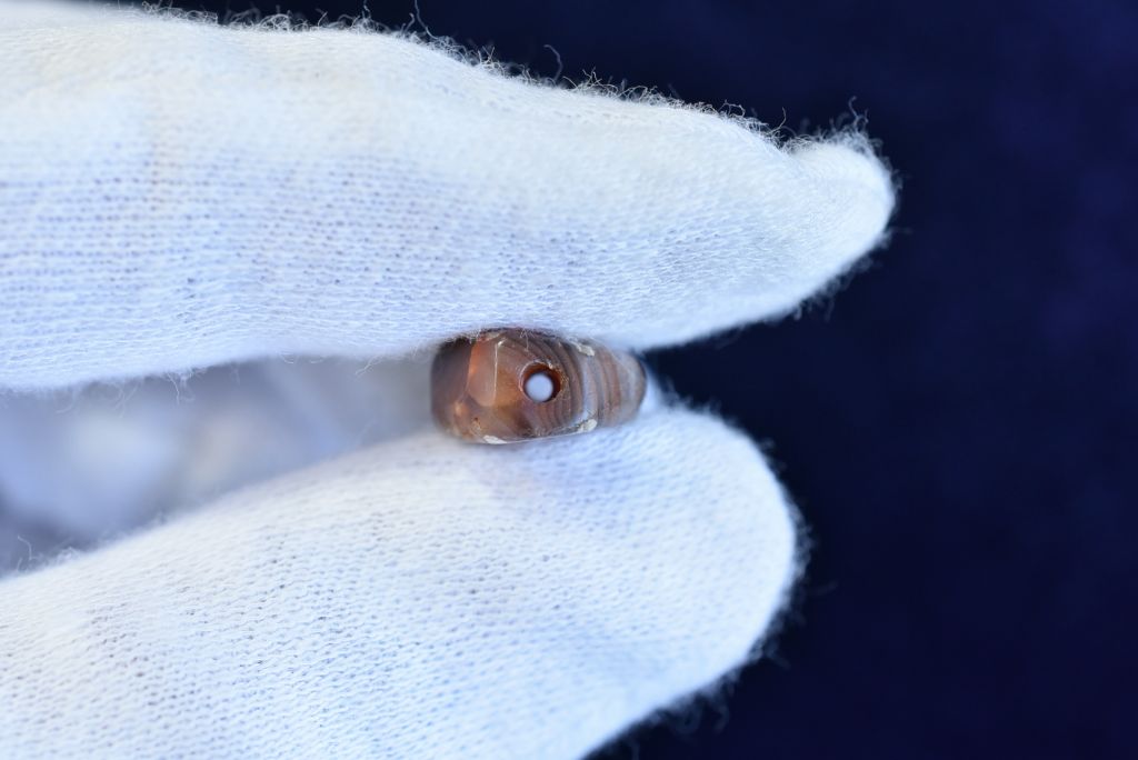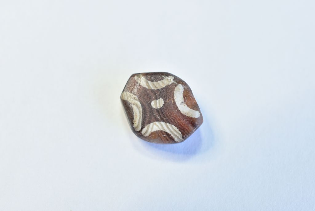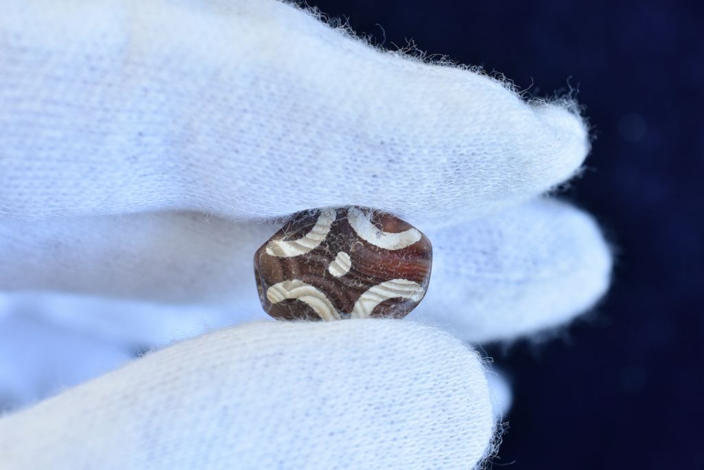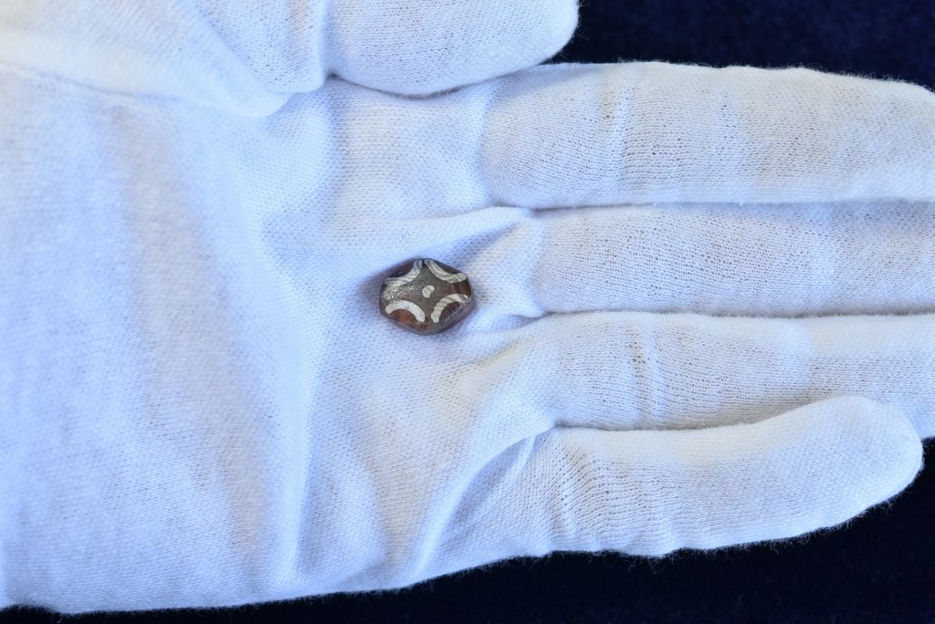 反対側。カットしたカーネリアンに、炭酸ナトリウムとケルダ(インドで香辛料として使われる植物)の樹液を混ぜた液体で模様を描き、焼き付けて製作しています。