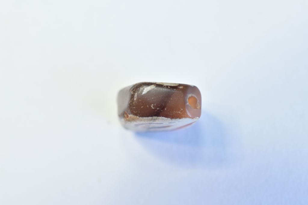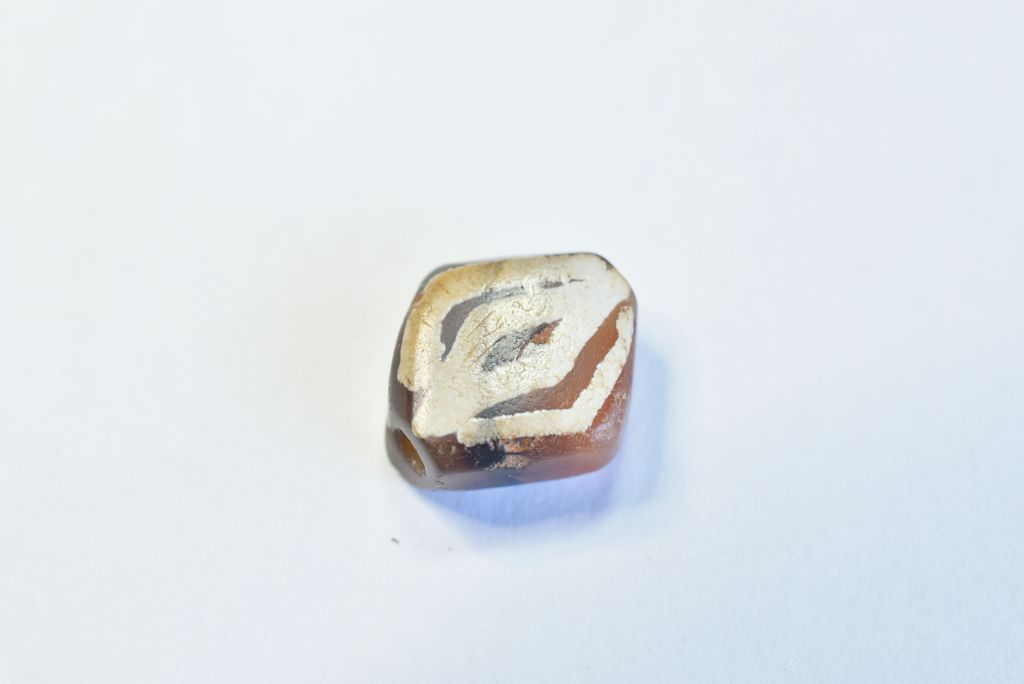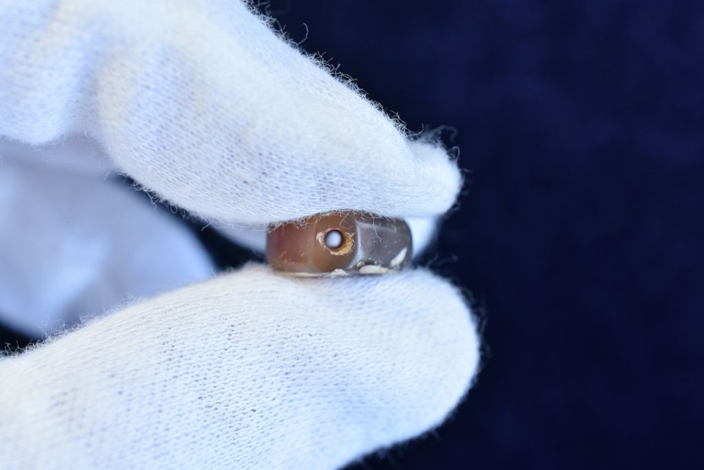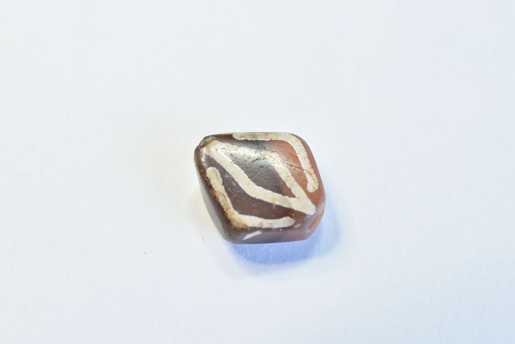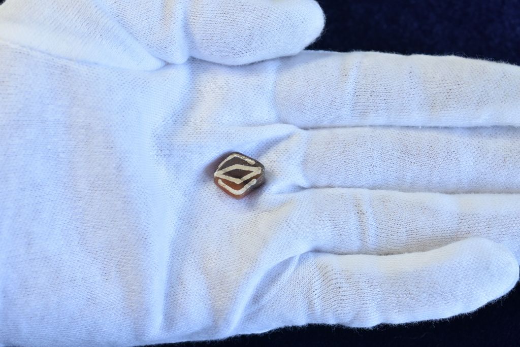 反対側。カットしたカーネリアンに、炭酸ナトリウムとケルダ(インドで香辛料として使われる植物)の樹液を混ぜた液体で模様を描き、焼き付けて製作しています。