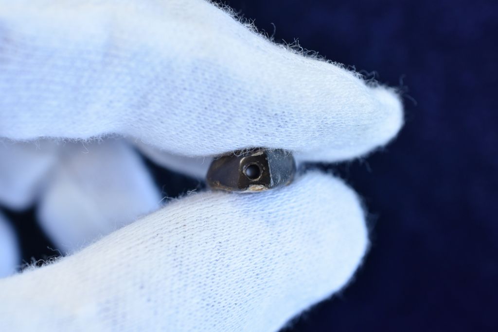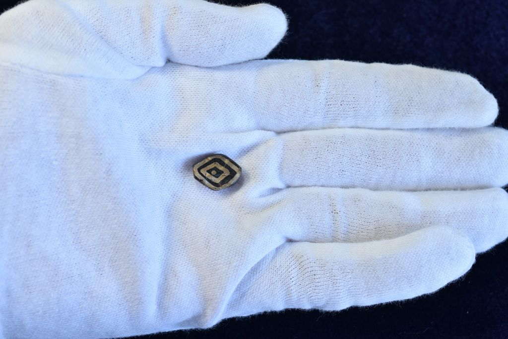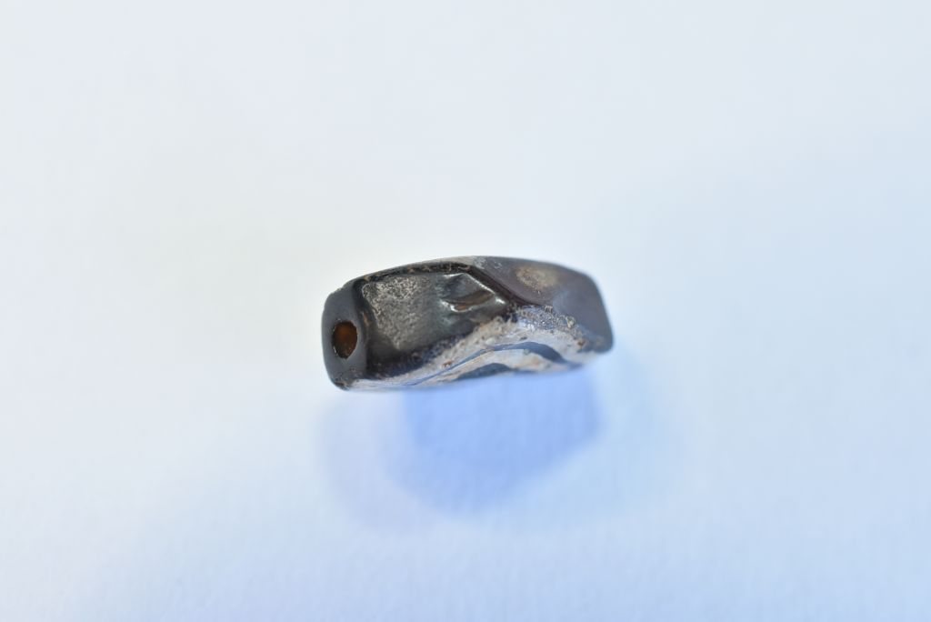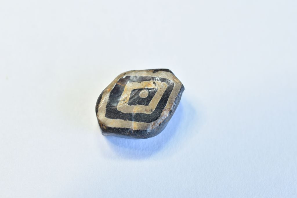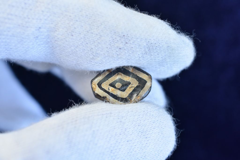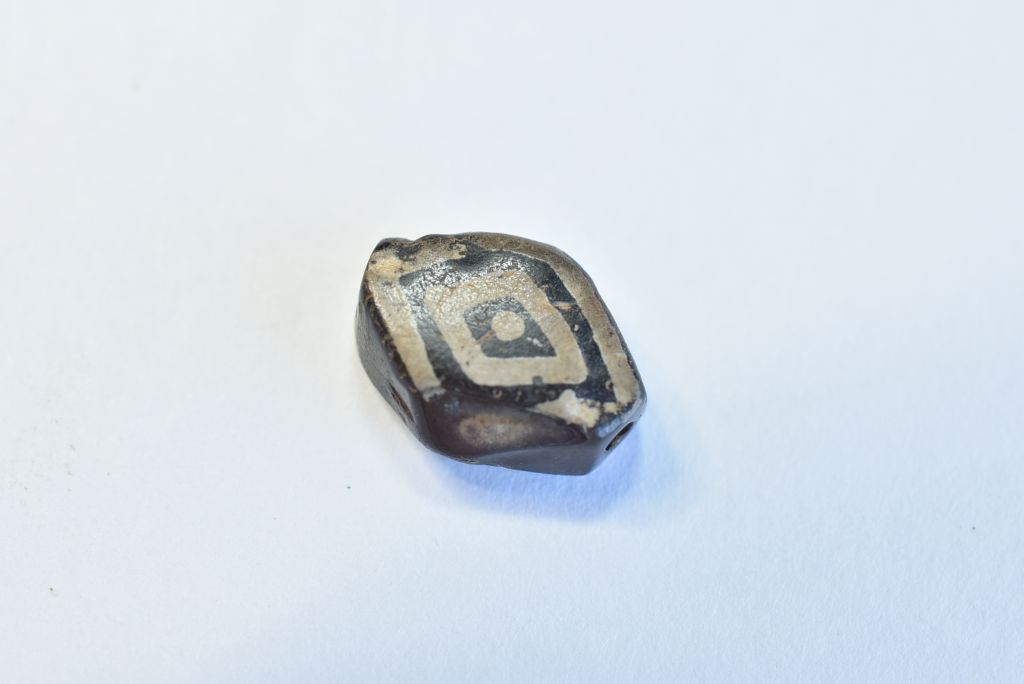 反対側。カットしたカーネリアンに、炭酸ナトリウムとケルダ(インドで香辛料として使われる植物)の樹液を混ぜた液体で模様を描き、焼き付けて製作しています。