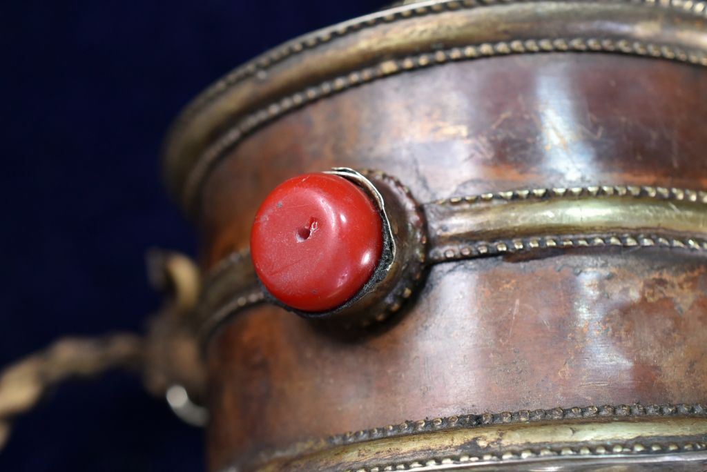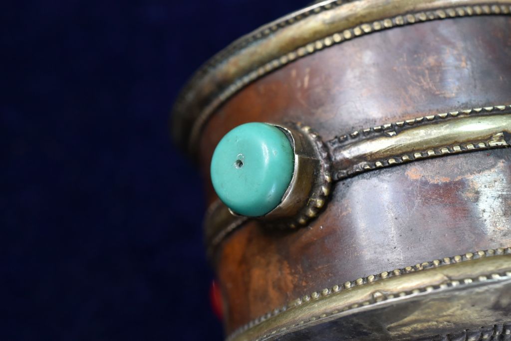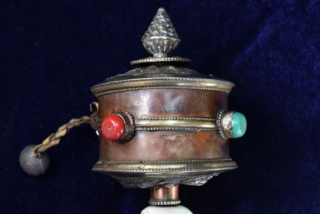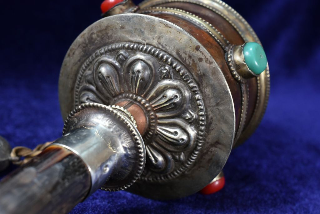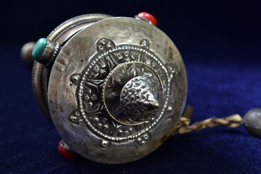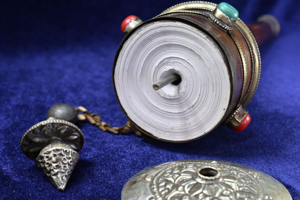 重い筒は経典がぎっしりと収まり、古いビーズがはめ込まれています。