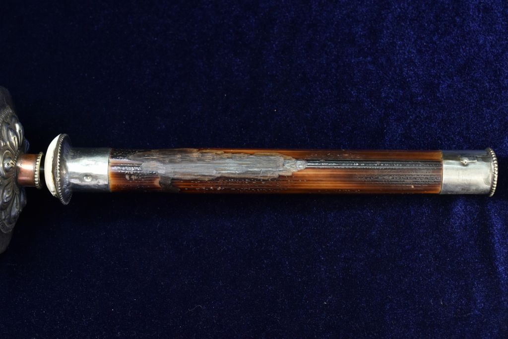 持ち手は、バター茶を作る際に使う柳の攪拌棒からできており、バターの成分で表面が黒くなっています。