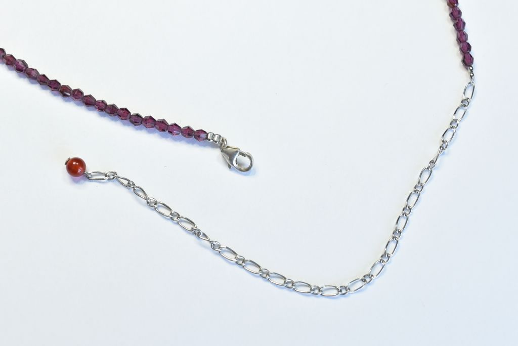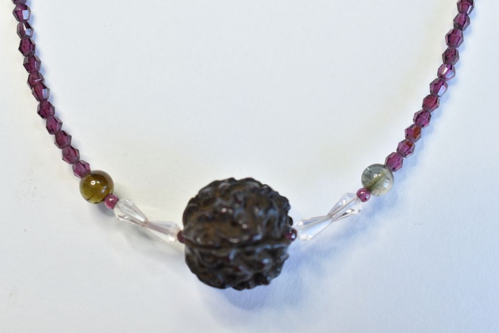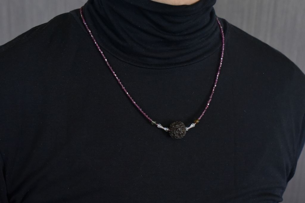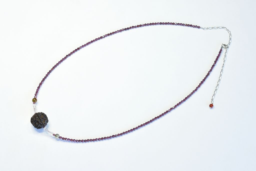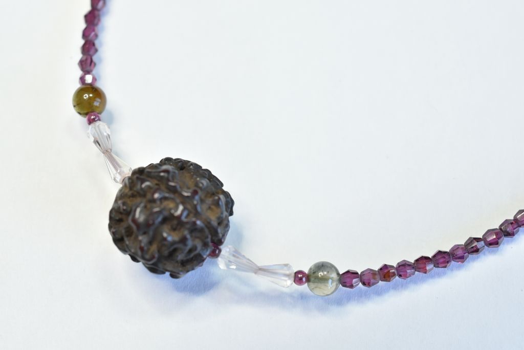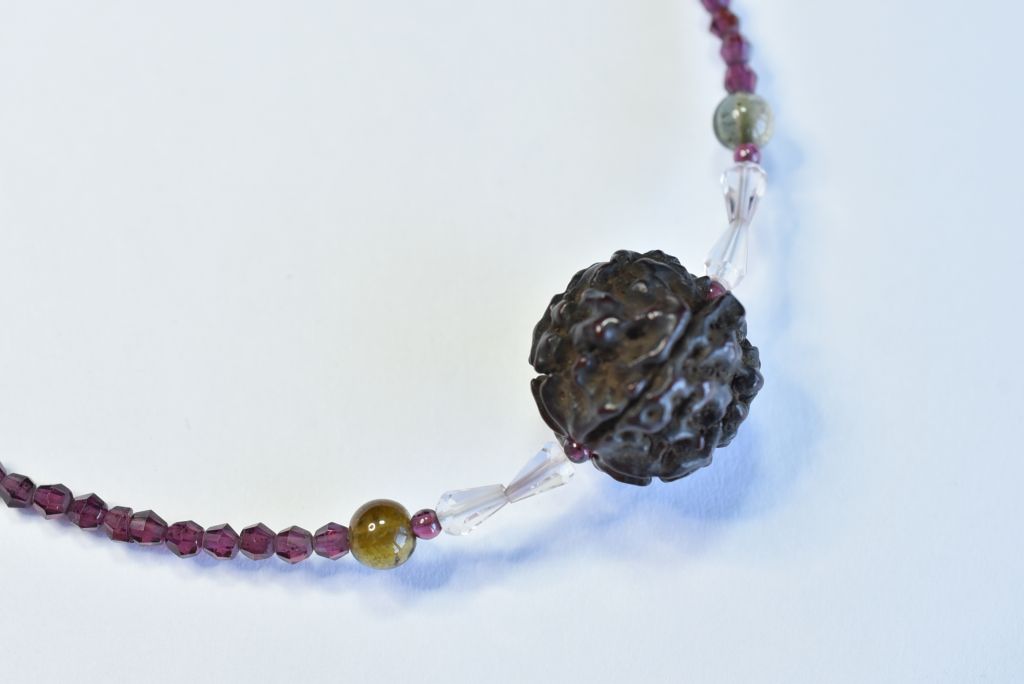 周りに配置したビーズは、ガーネット、ローズクォーツ、トルマリンです。