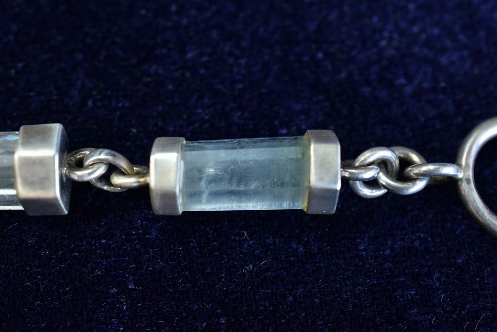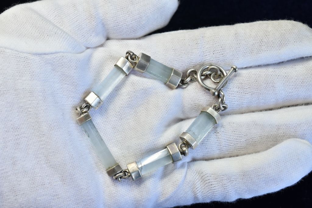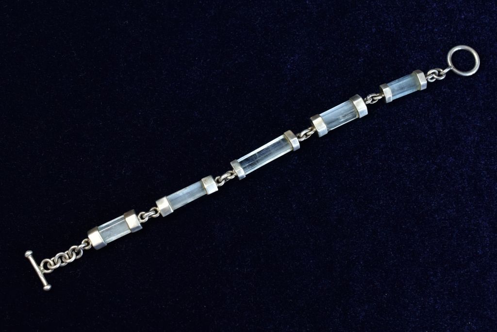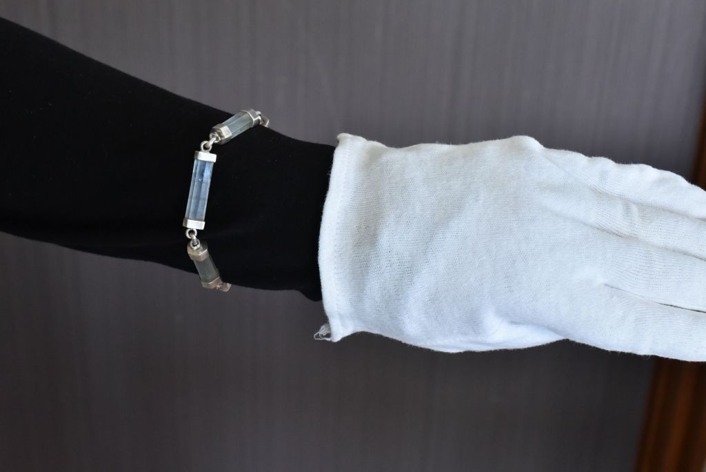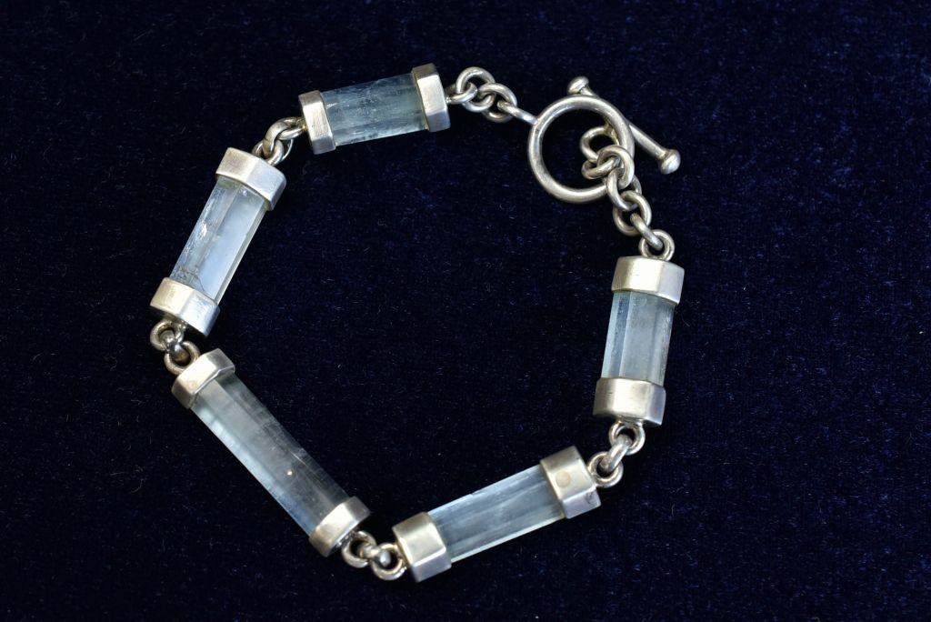 その山の中腹、標高5,000付近で採取された天然のアクアマリンを5個、シルバーのキャップに被せて繋げた珍しいスタイルのブレスレットです。